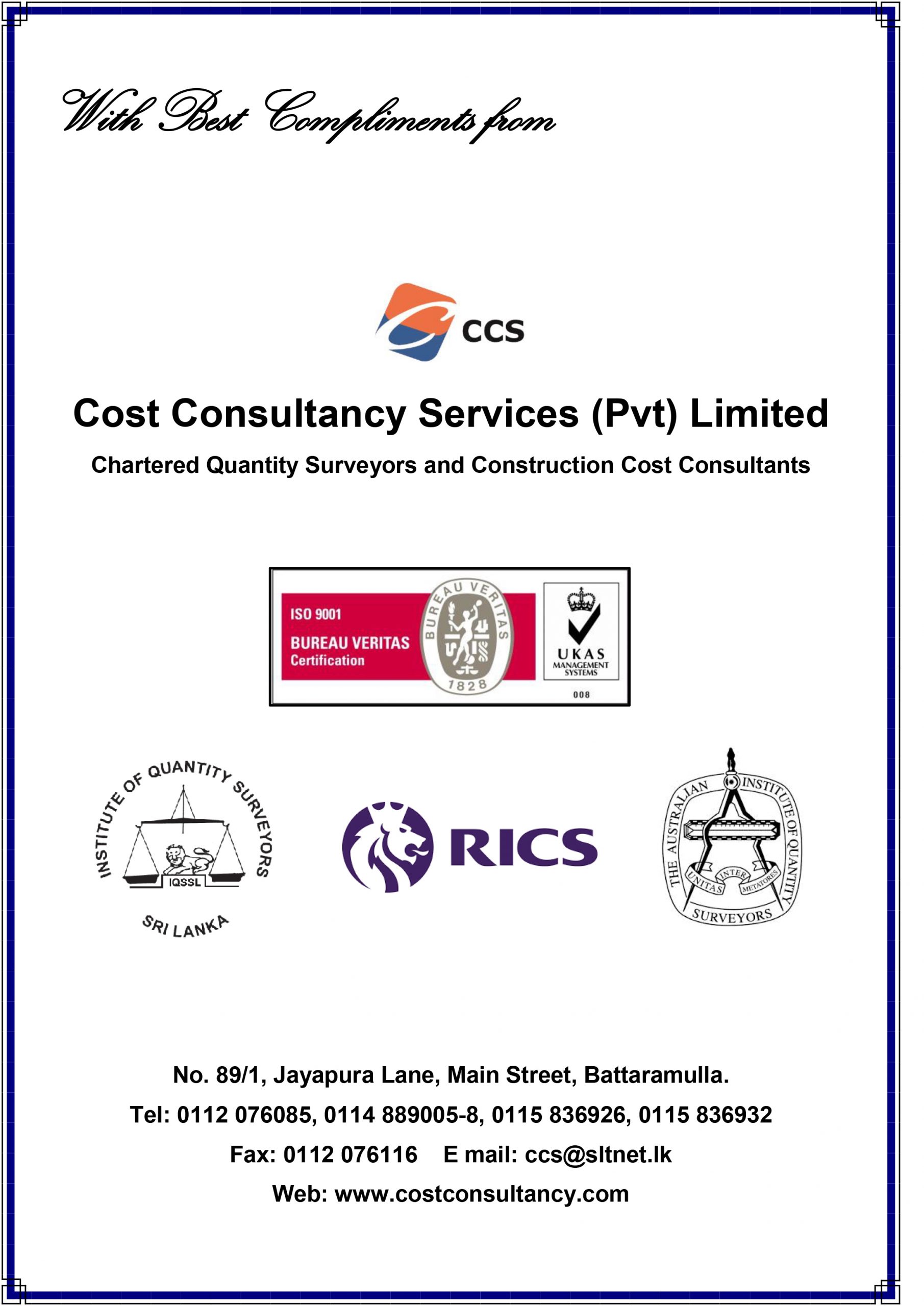 Cost Consultancy Services (Pvt) Ltd. (successor to the partnership known as the “Cost Consultancy Services”), is a company formed by two professionals for the purpose of undertaking Quantity Surveying and Construction Cost Consultancy Services in Building and Civil Engineering projects. The Organization commenced operations as a partnership in 1987 and subsequently was registered as a private limited liability company in 1994. This is the first independent and ISO Certified Quantity Surveying Organization in Sri Lanka run by Sri Lankan nationals.