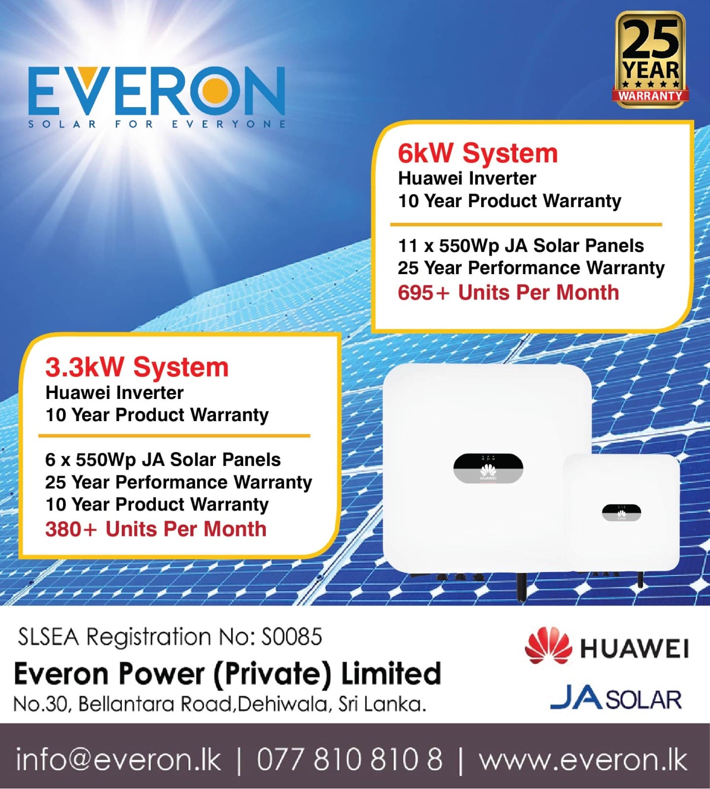 We are a renewable energy company based in Colombo, Sri Lanka. Our values being Quality, Trust and Integrity. Our systems are designed and installed to the highest standards. We install grid tied solar systems, off grid and hybrid solar systems and power backup systems. We believe in providing solar power solutions to everyone hence our tagline ‘Solar for Everyone’. We are approved by the Sri Lanka Sustainable Energy Authority (SLSEA), Ceylon Electricity Board (CEB) and Lanka Electricity Company (Private) Limited (LECO).